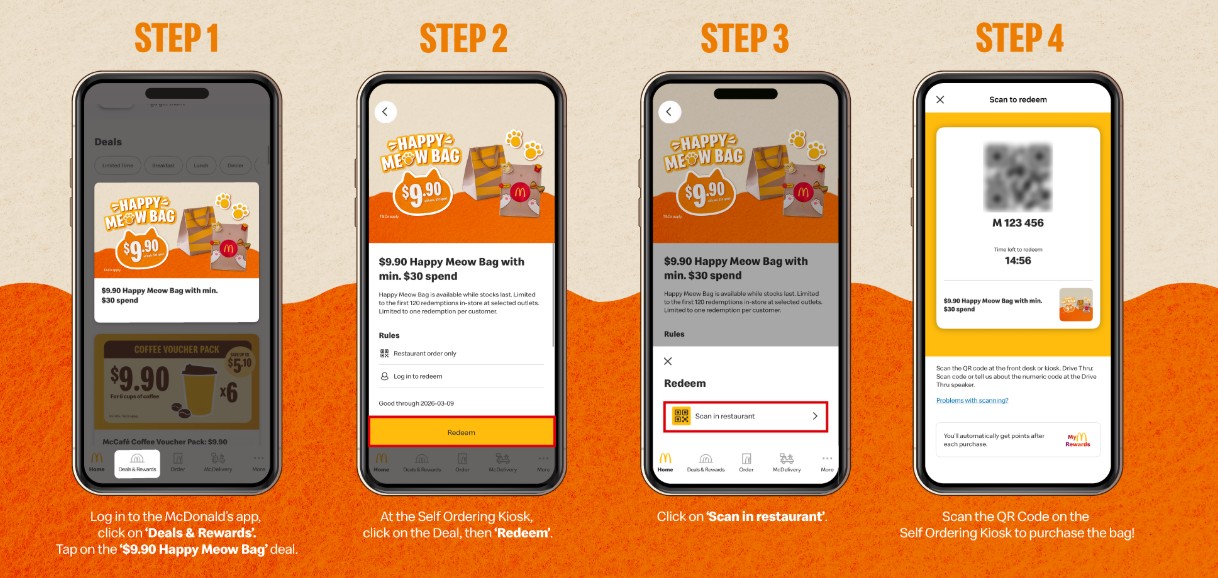 - At the restaurant’s Self-Ordering Kiosk, tap the “Deals & Rewards” tab to locate the offer: “$9.90 Happy Meow Bag with minimum $30 spend.”
